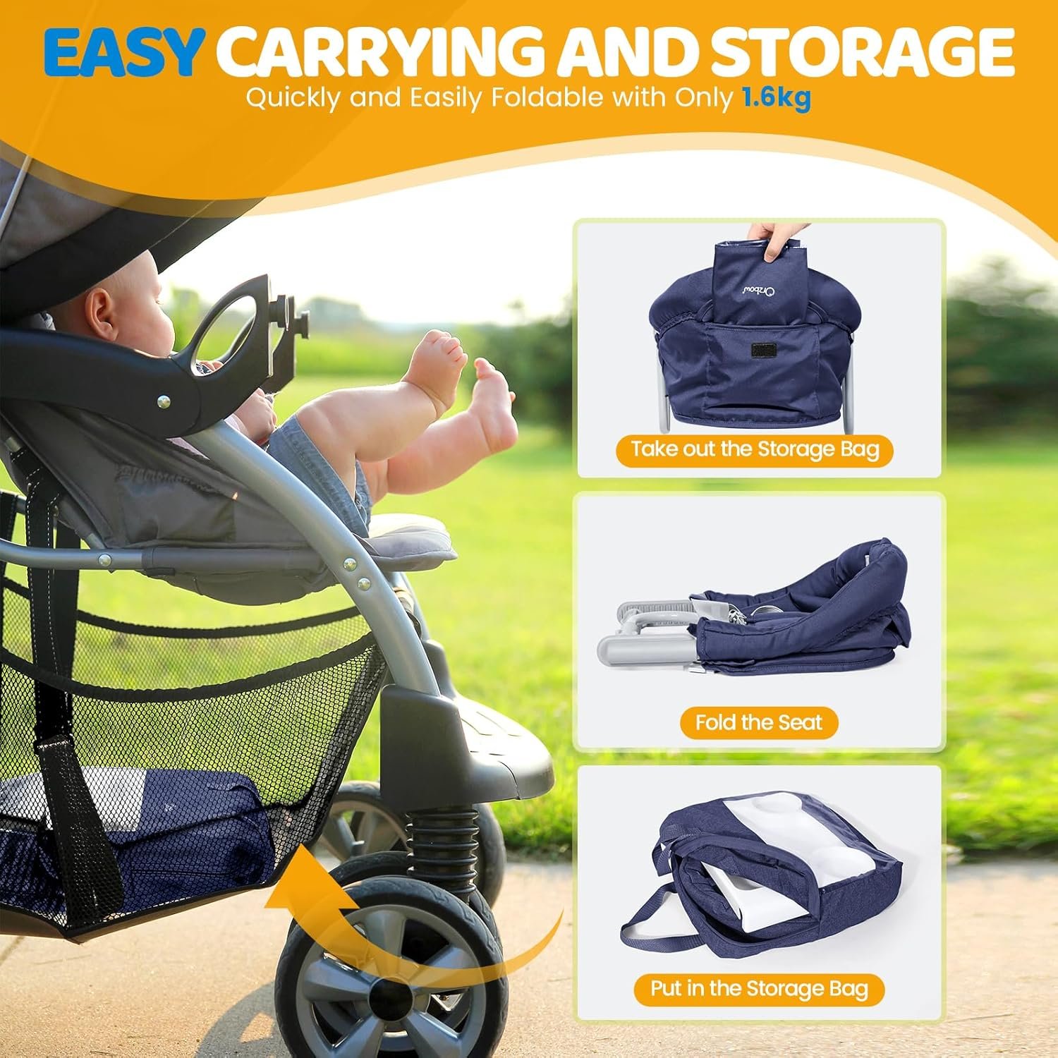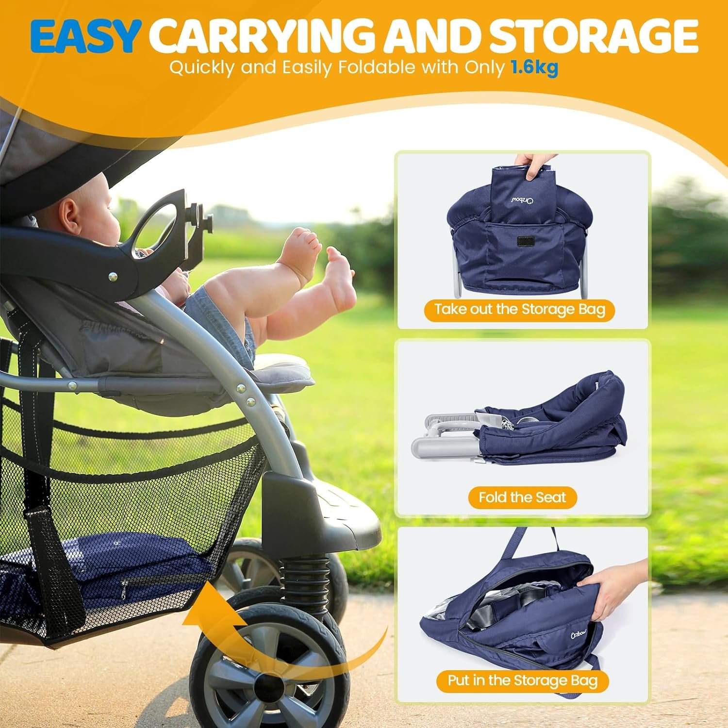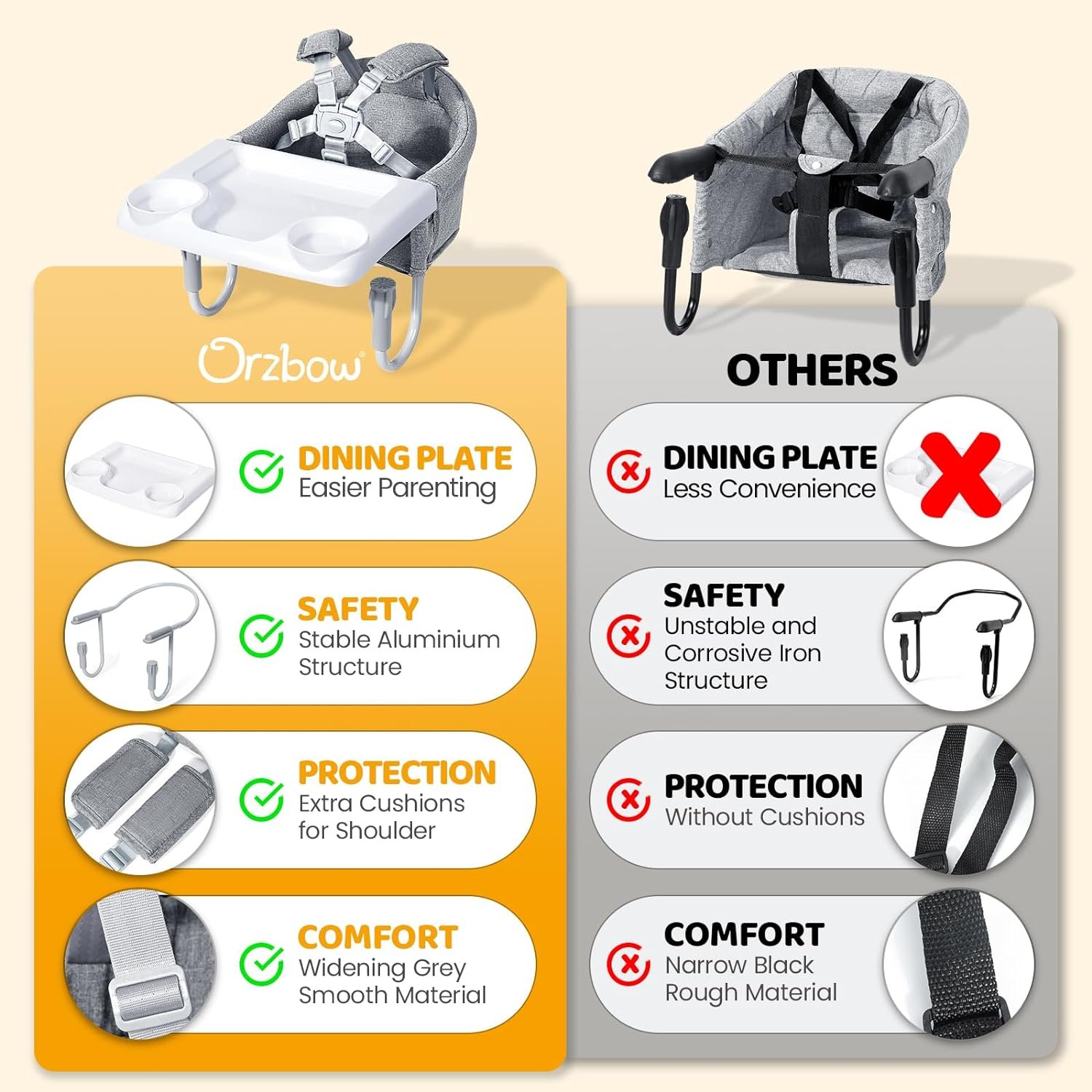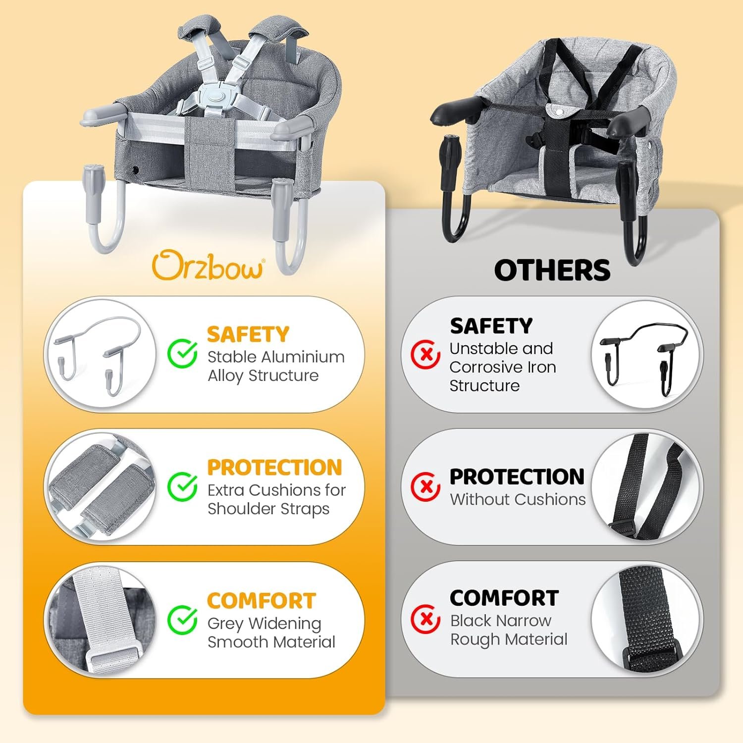 - 🌟 𝐆𝐑𝐄𝐀𝐓 𝐂𝐎𝐍𝐕𝐄𝐍𝐈𝐄𝐍𝐂𝐄: Orzbow Hook-on Baby Feeding Seat can be easily and quickly folded into the carrying bag included and taken to anywhere you want without taking lots of space and energy,which is fairly convenient for daily life or family union.