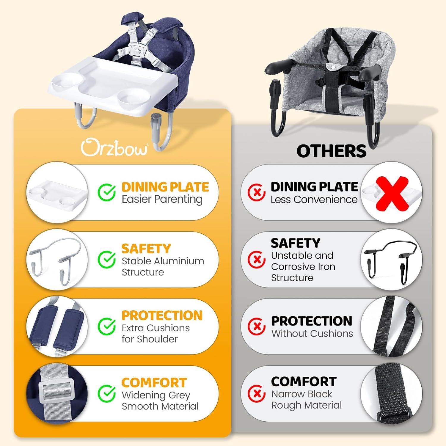 - 💡 𝐔𝐍𝐈𝐐𝐔𝐄 𝐀𝐍𝐃 𝐏𝐑𝐀𝐂𝐓𝐈𝐂𝐀𝐋 𝐃𝐄𝐒𝐈𝐆𝐍: Designed with extra padding mats on the widened shoulder straps,Orzbow Hook-on Dining Chair not only provides ultimate comfort for the shoulders and neck, but it also avoids the risk of cutting baby’s body, greatly increasing safety in a way that no other chair does,which is the second most important reason why you need it.